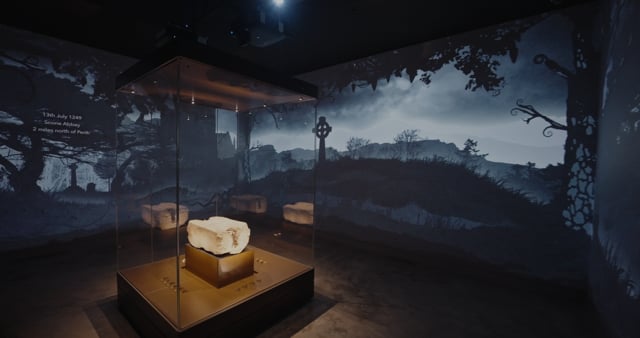 59 Productions with music by Pippa Murphy created two immersive films; one for the antechamber which describes the history, origin myths and significance that surround the Stone of Destiny, and one for ‘The Stone Room’ – where the Stone itself sits, an atmospheric original animation depicting the coronation of King Alexander III of Scotland in 1249 at Scone.